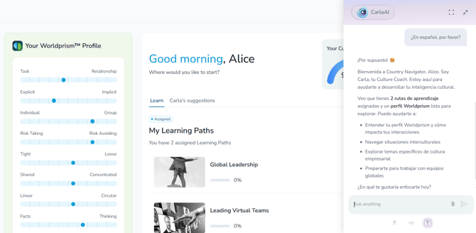 Country Navigator offers Worldprism™ in 10 languages, subtitled videos, and Carla's AI support in 100+ languages.