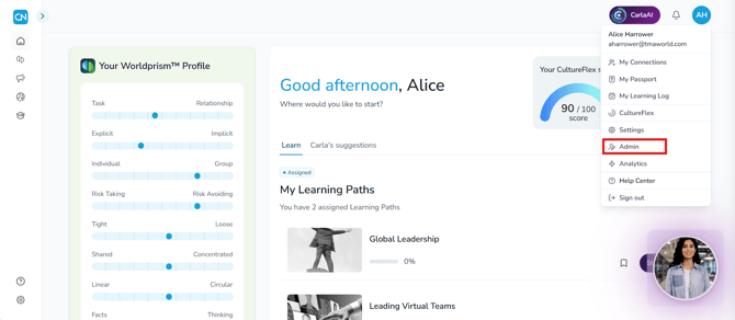 Go to the Admin page: click your user icon in the top right-hand corner, and select ‘Admin’ from the drop-down menu.
