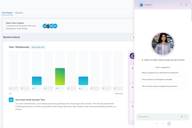 Once you've completed the guided tour of your team profile, it's time to explore your profile with Carla. You'll find her floating on the right-hand-side of the Team Report tab, helping bring your insights to life. She can assist you in making sense of your team's cultural dynamics and offering practical, real-world strategies to boost collaboration, communication, and cohesion.