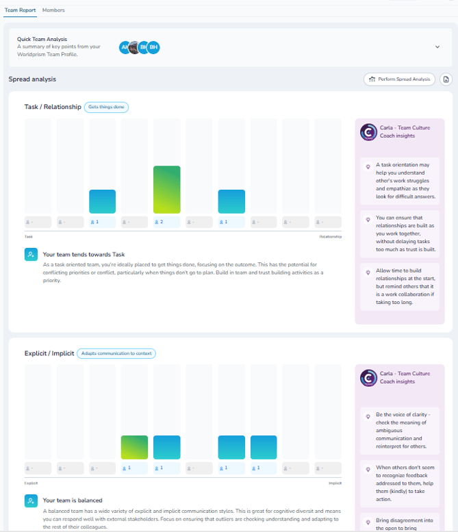 Use the Team Report tab to explore your team’s cultural profile in detail. The report gives you a snapshot of where your team sits across the nine Worldprism™ dimensions, complete with Carla’s top three coaching insights tailored to your team’s specific positioning.