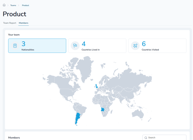 You’ll find a map that brings your team’s global experiences to life, showing your team’s nationalities, where they’ve lived, and where they’ve travelled. It’s a great way to appreciate the diversity of perspectives within your team and see how international experiences contribute to your cultural strengths.