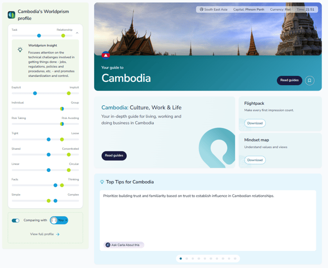 We currently have cultural profiles, guides and practical learning on 106 countries based on the countries our clients are working in. And we add to the number regularly. Each country guide consists of nine sections: making a good impression, meetings and presentations, working together, managing relationships, economy and politics, society, diversity, language and geography. And of course, each country has a Worldprism™ profile with detailed feedback and advice.