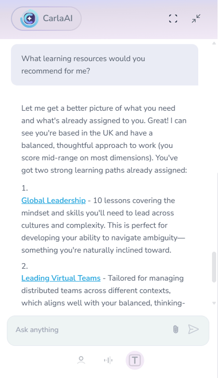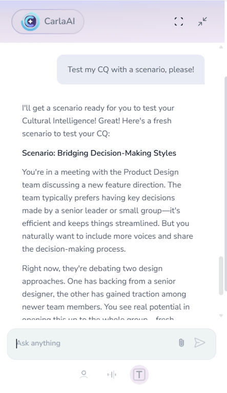 Carla is uniquely trained with Country Navigator data and insights. This means that Carla offers culturally validated guidance that is specifically aligned with CQ principles, rather than relying on generic or presumptive advice.