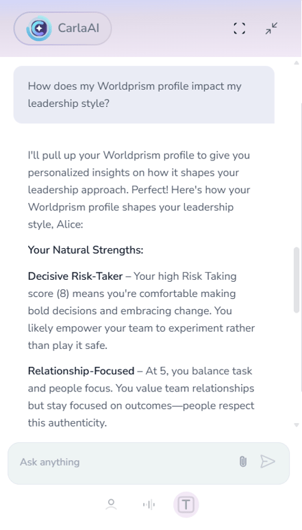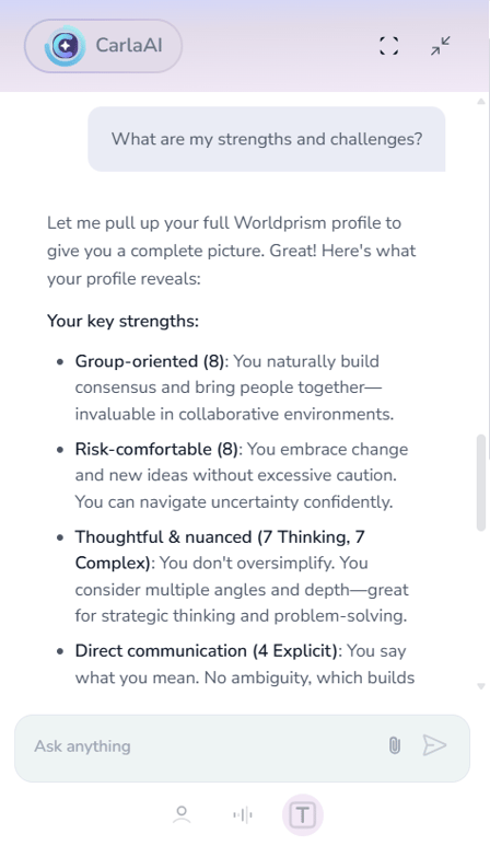 Carla provides advice that is customized to your Worldprism™ profile and professional circumstances, including the profiles your platform connections and teams, ensuring relevance to you in a variety of settings. Carla helps you to enhance your communication, making it resonate well across cultural backgrounds and helping you lead or integrate into teams more effectively.