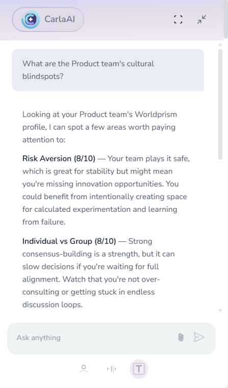 Carla avoids generalized guidance by personalizing your ****coaching. Carla knows your Worldprism™ profile, customizing responses to your specific cultural dimension placements to help you to navigate and optimize your interactions effectively.